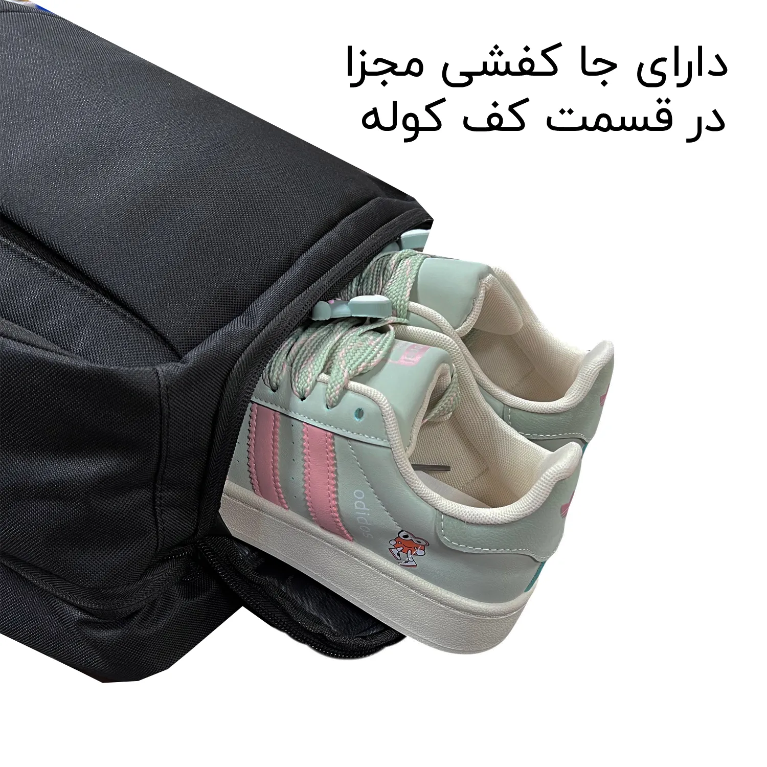 در قسمت کف این کوله هم یک جاکفشی با آستر مجزا تعبیه شده که کفش تا سایز 45 به راحتی داخلش قرار میگیره